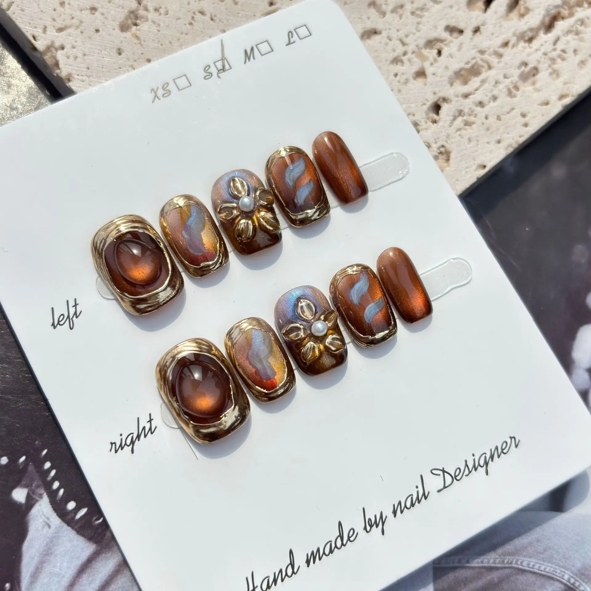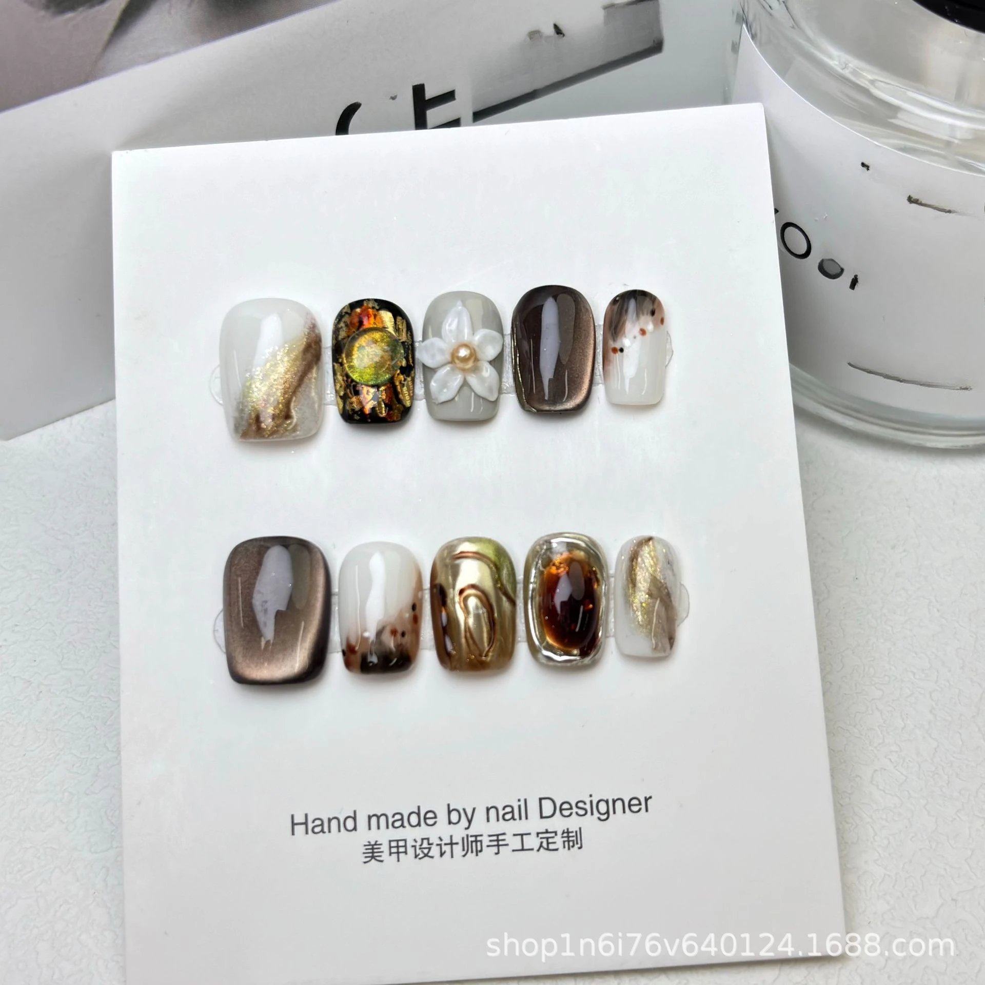 Shopmocho 10Pcs 3D Flower Handmade Press on Nails Short Square Fake Nails Brown Wearable Stick-on Nails False Nail Накладные Ногти 네일팁