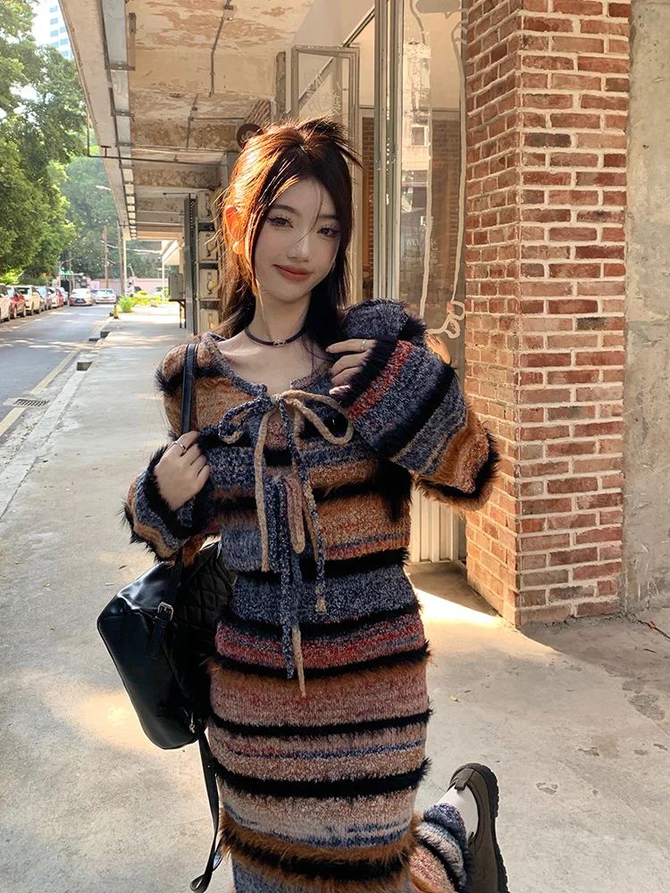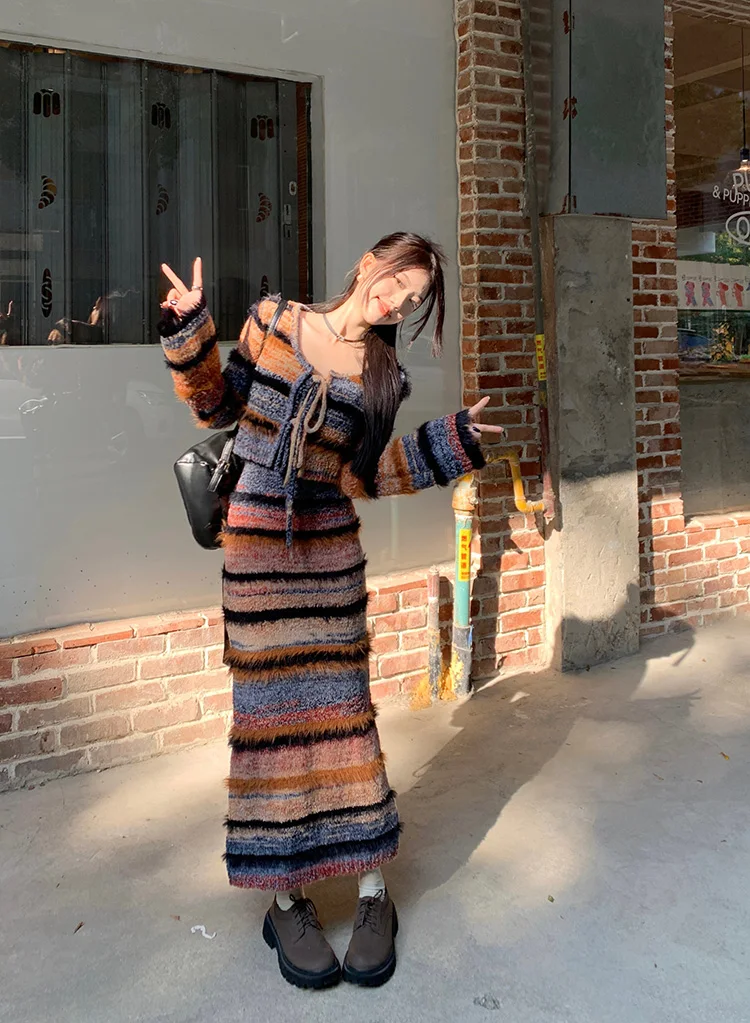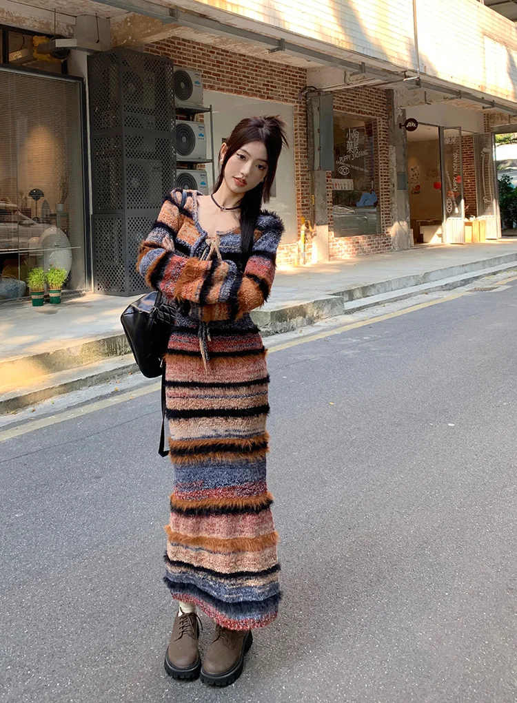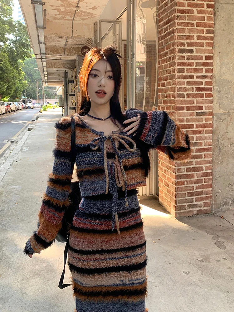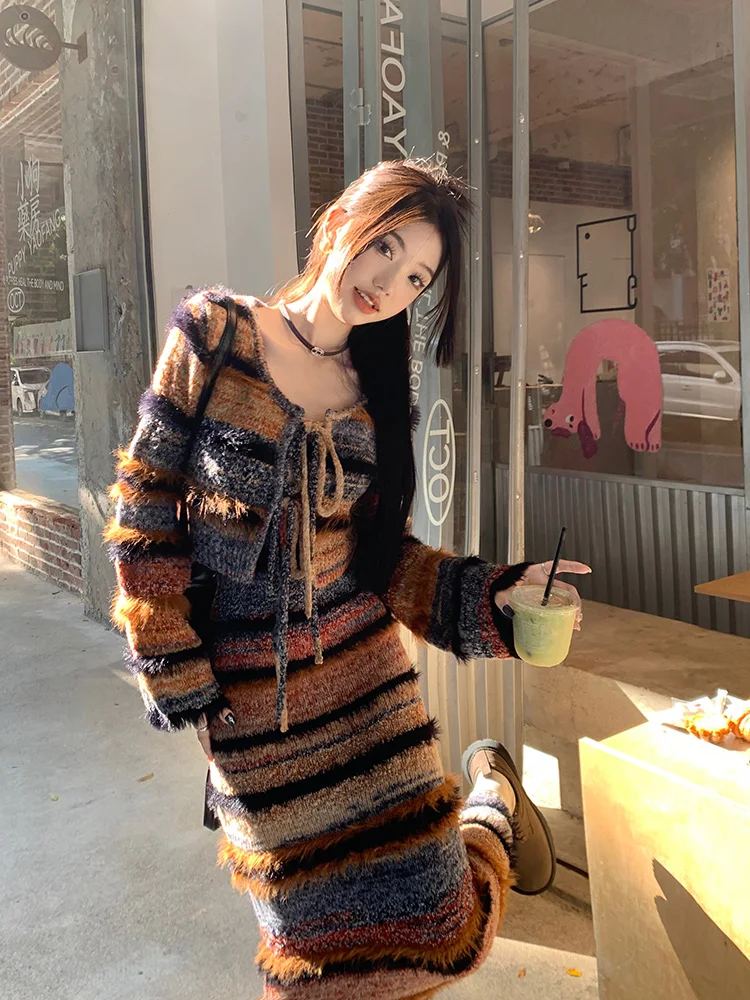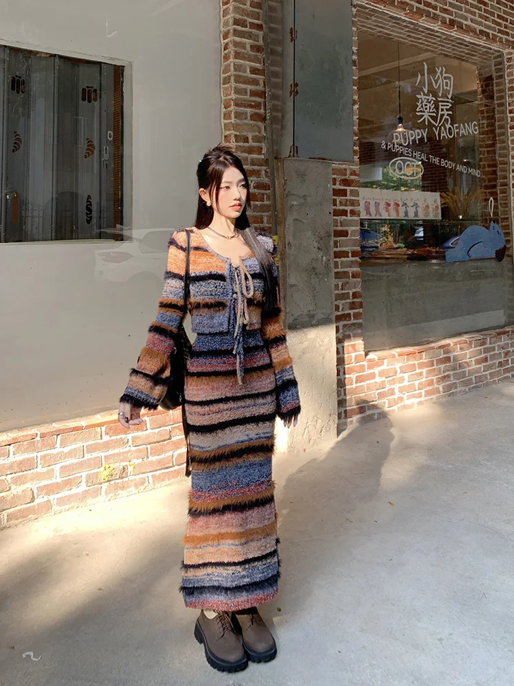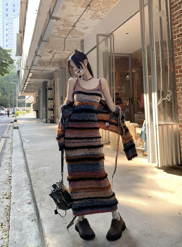 Shopmocho Korean style Spring Autumn New Streetwear Sexy Long-sleeved Cardigan Women Striped Knit Sling Dress Two-piece Suit
