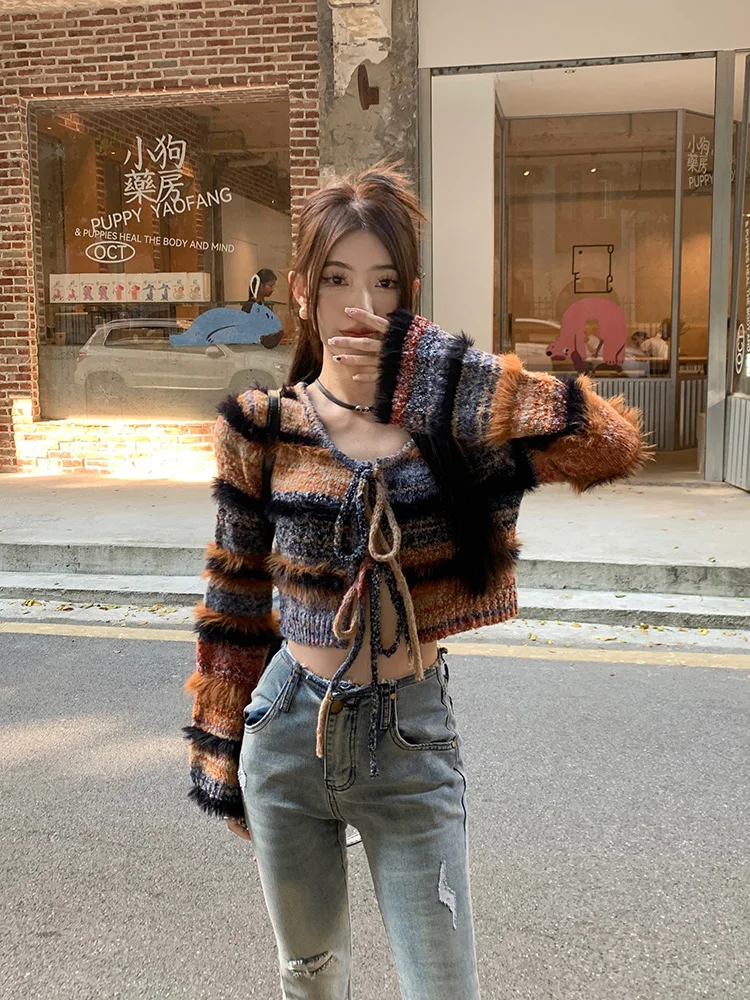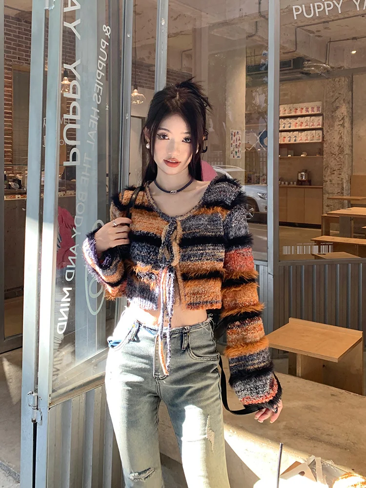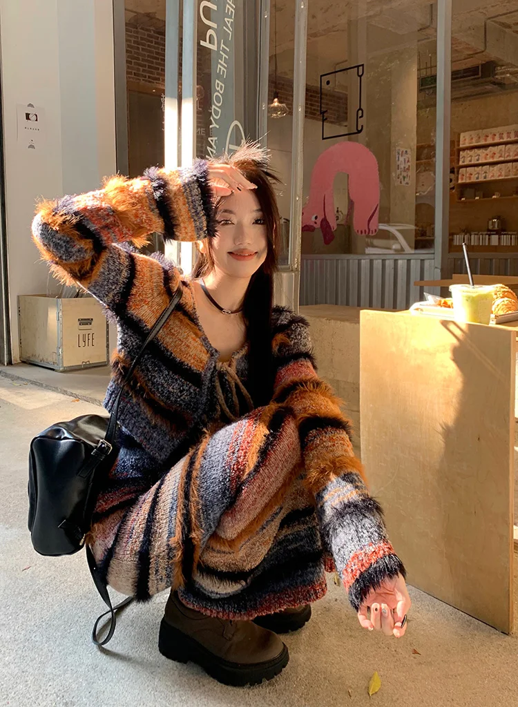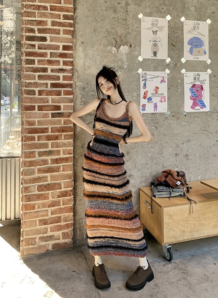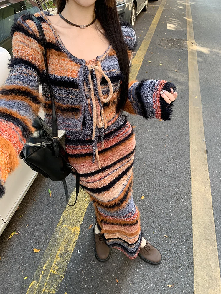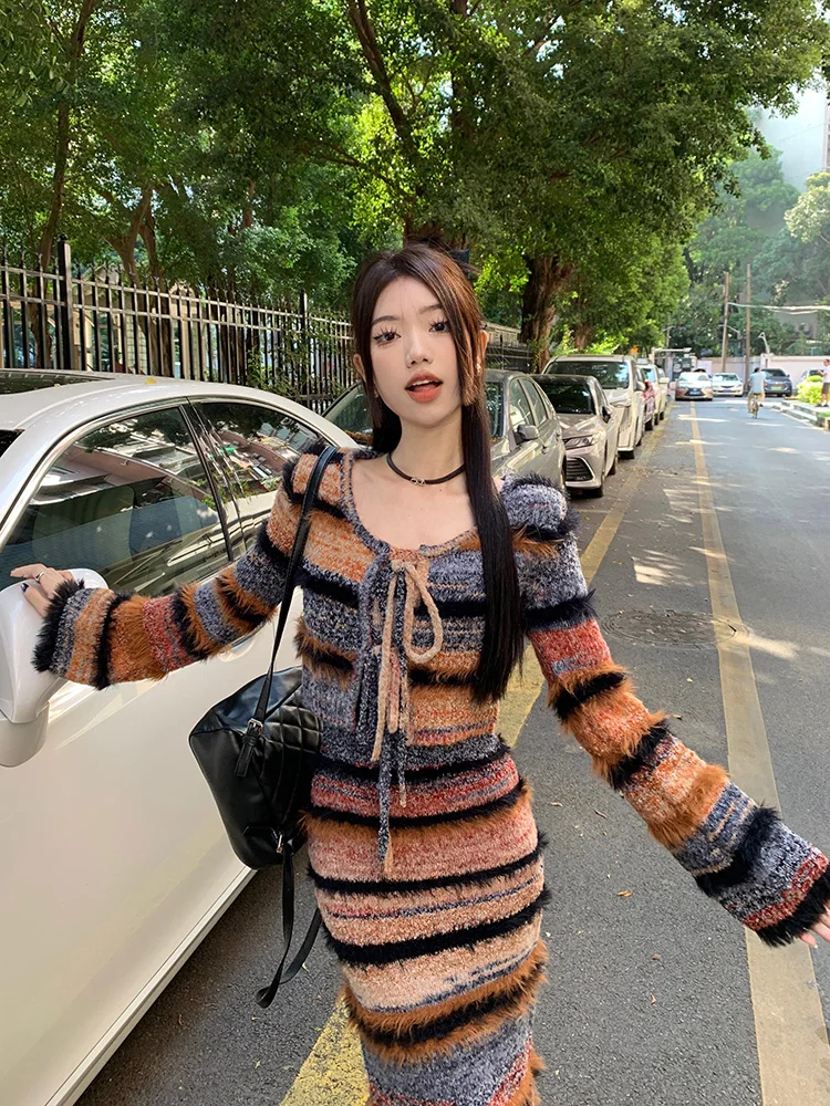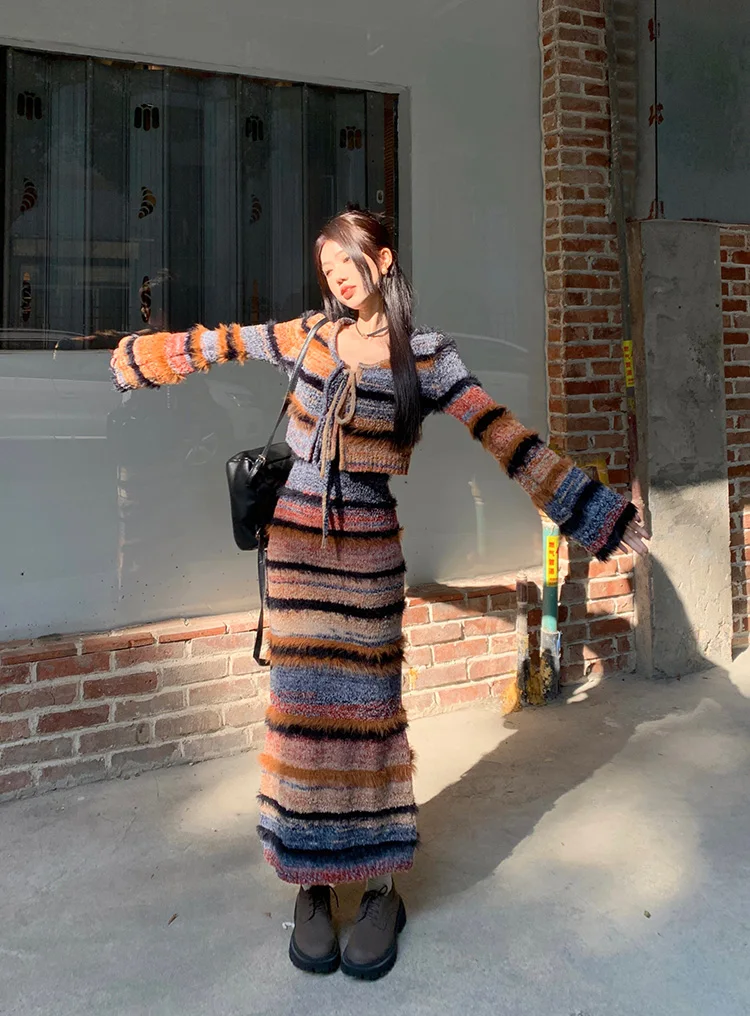 Shopmocho Korean style Spring Autumn New Streetwear Sexy Long-sleeved Cardigan Women Striped Knit Sling Dress Two-piece Suit