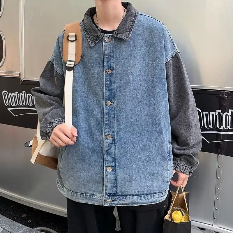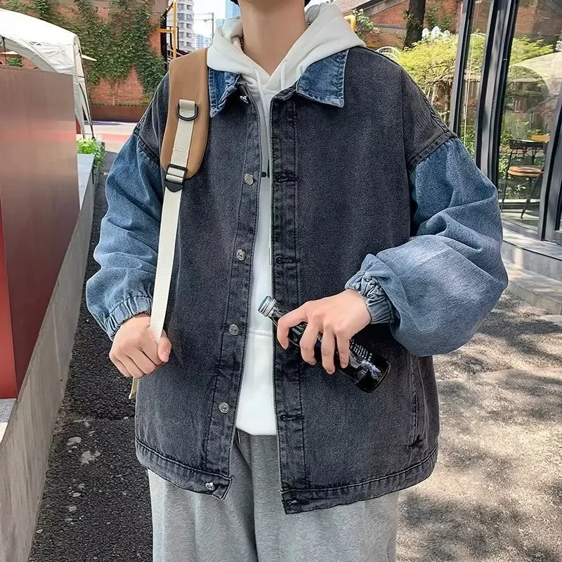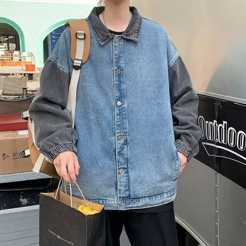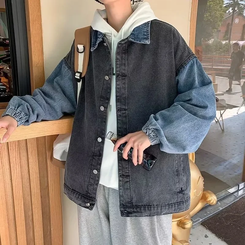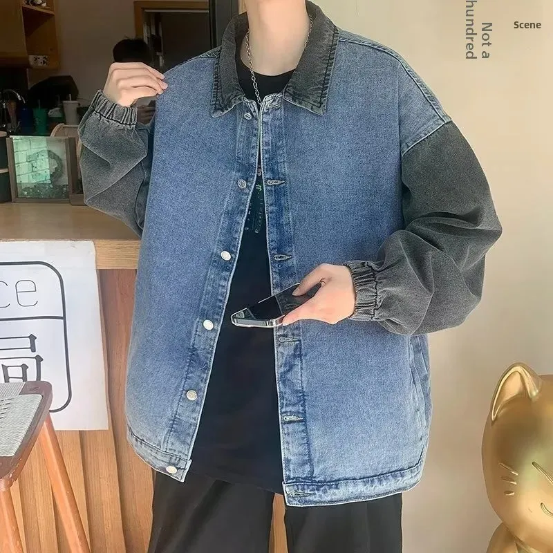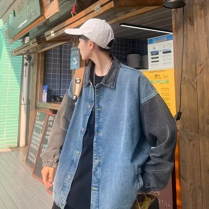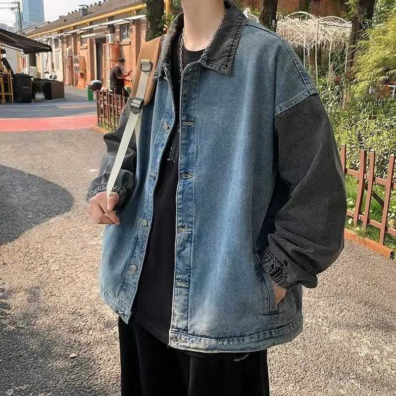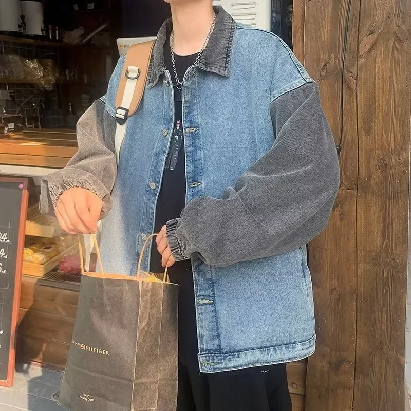 Shopmocho Retro Hong Kong Style Men's Denim Jacket Autumn Design Patchwork Color Block Collar Stand up Loose Fit Casual Trendy Top