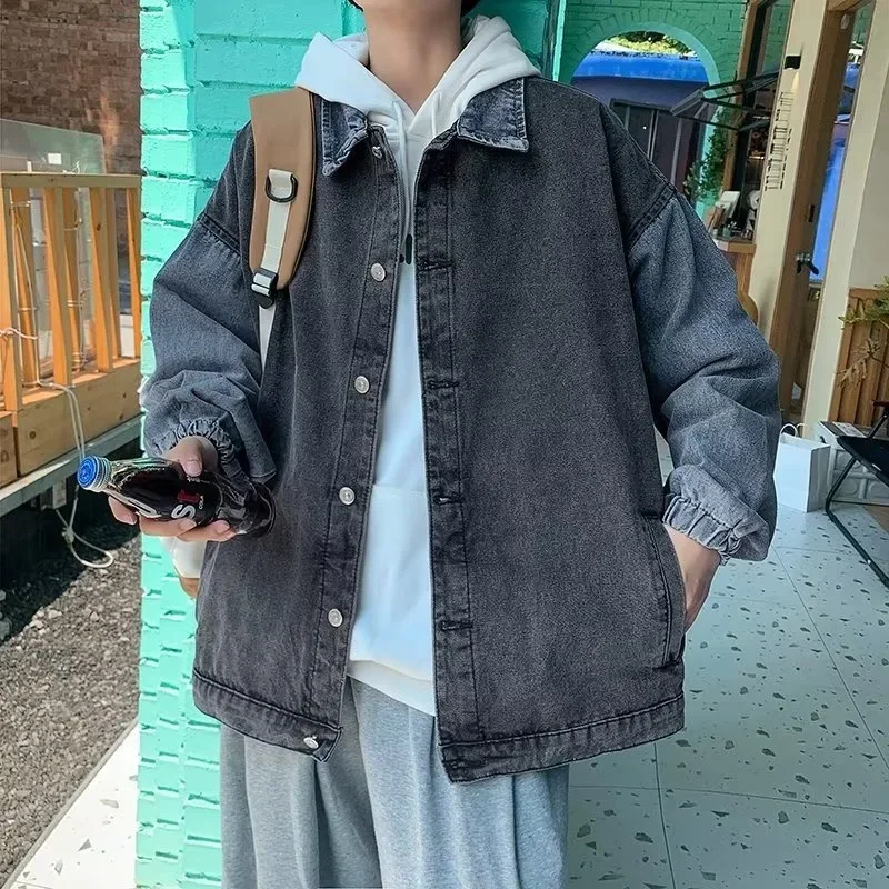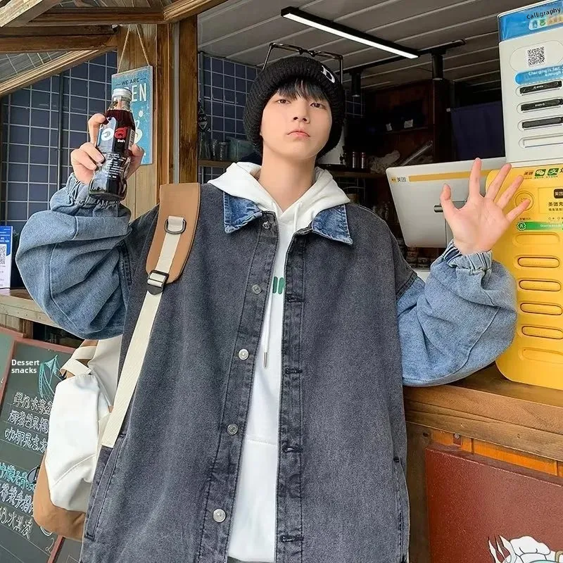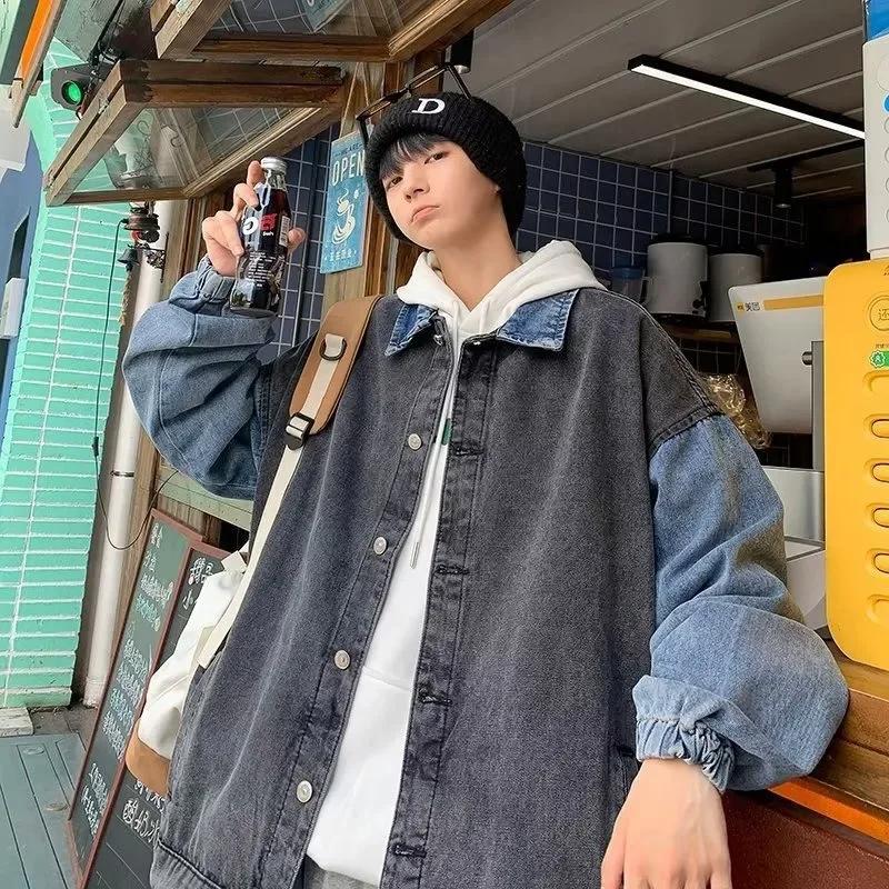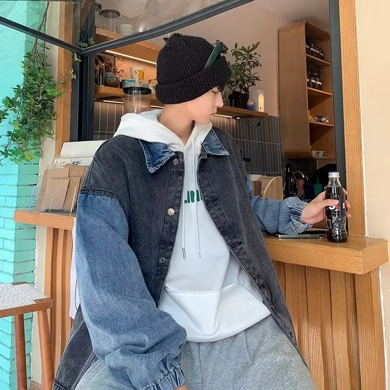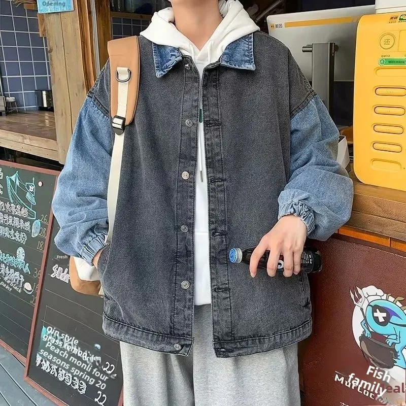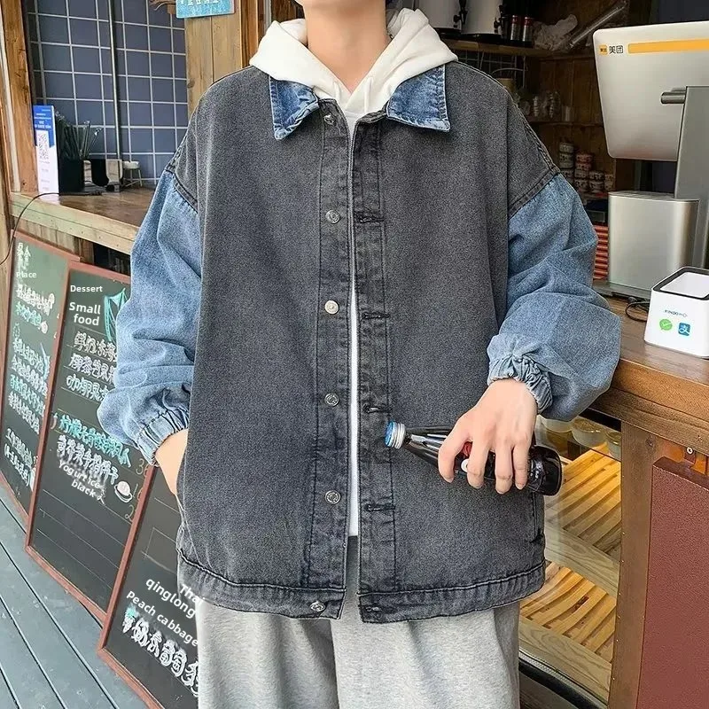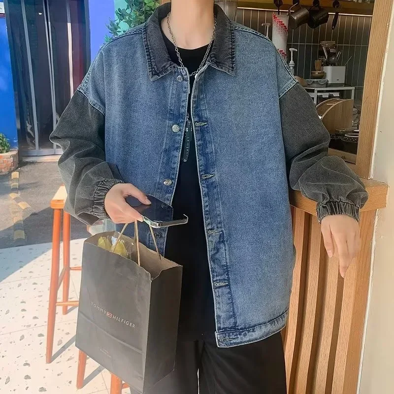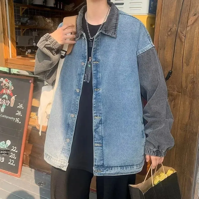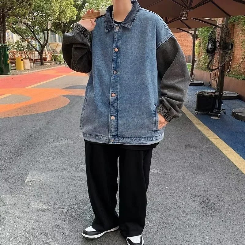Shopmocho Retro Hong Kong Style Men's Denim Jacket Autumn Design Patchwork Color Block Collar Stand up Loose Fit Casual Trendy Top