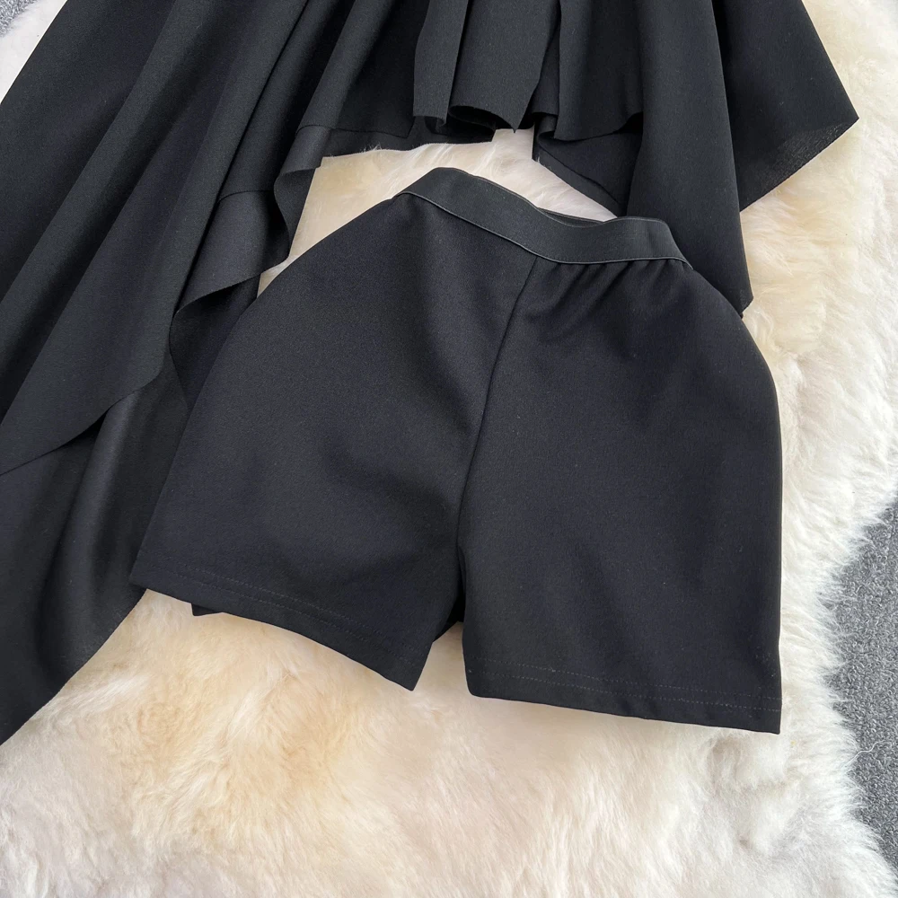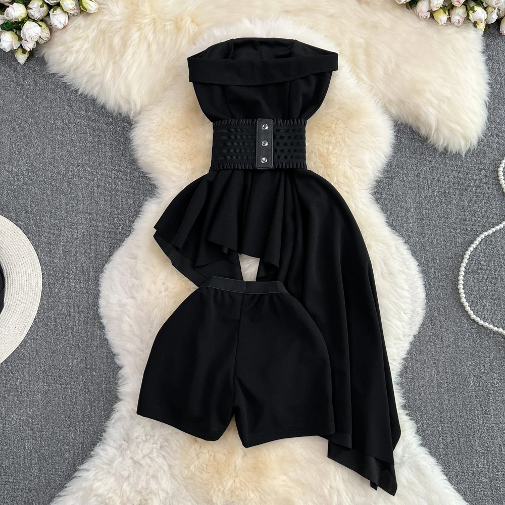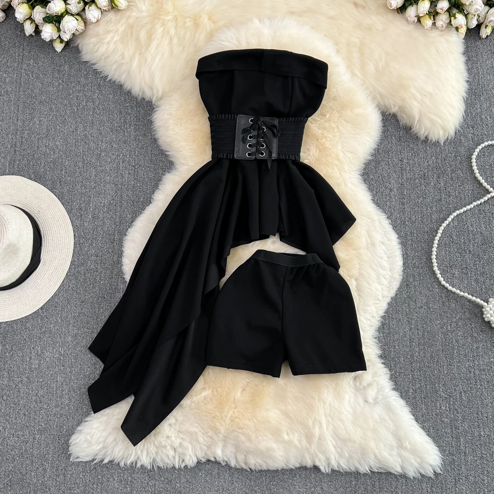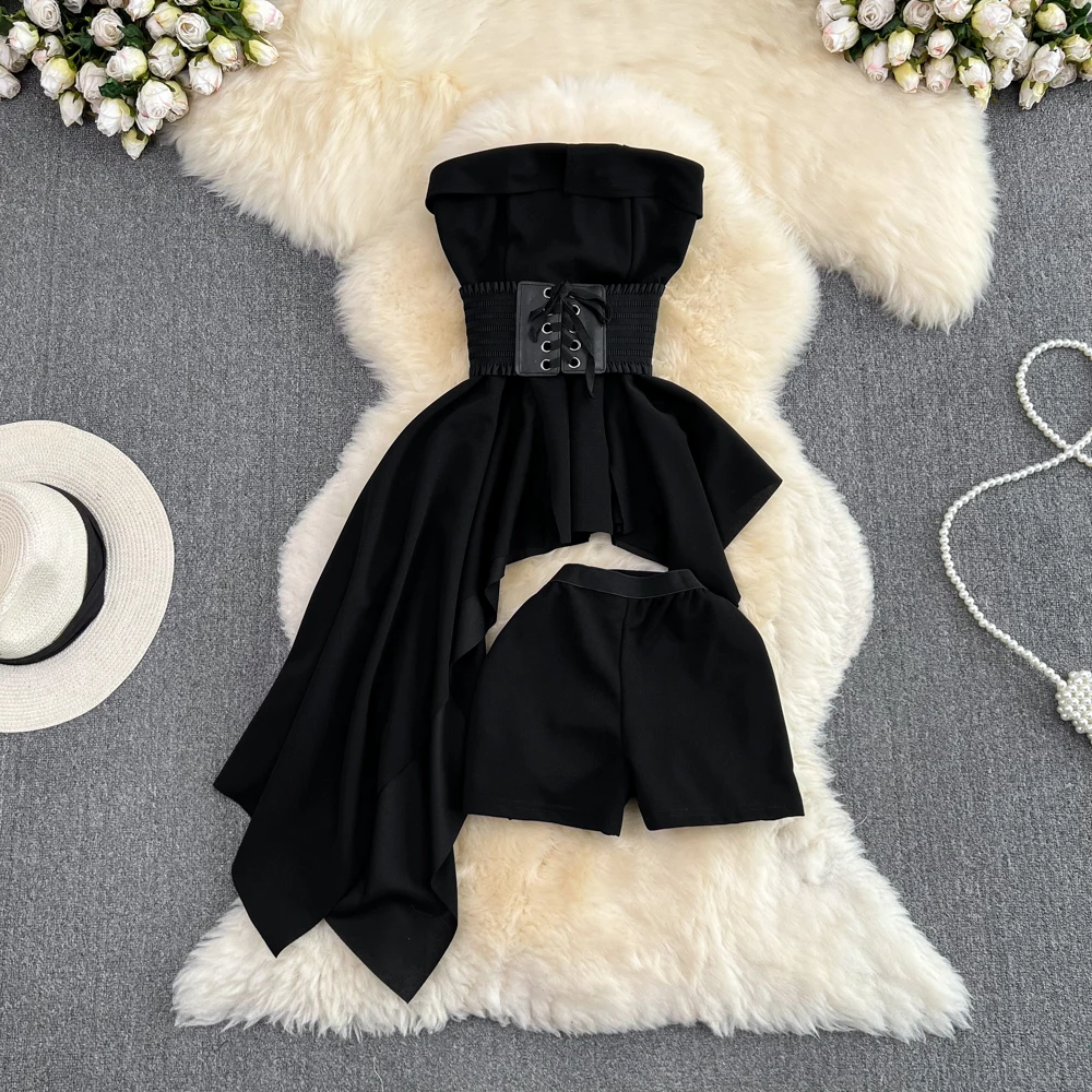 SHOPMOCHO2pcs Sets Women Outfits Fashion Strapless Irregular Skinny A-line Dresses+elastic High Waist Solid Wide-leg Shorts Femme Suits